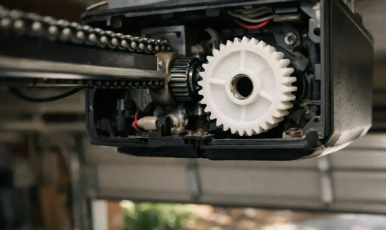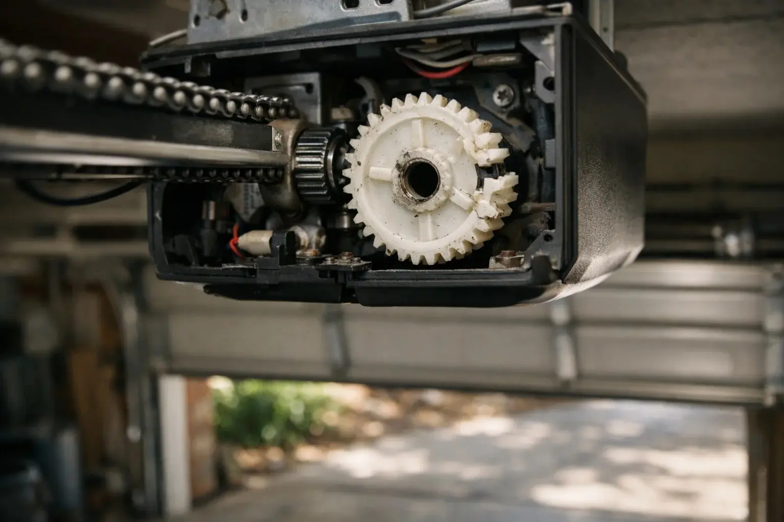 A garage door opener stopped halfway during operation due to worn internal gears. The damaged drive gear was replaced and the opener was recalibrated to restore smooth operation.